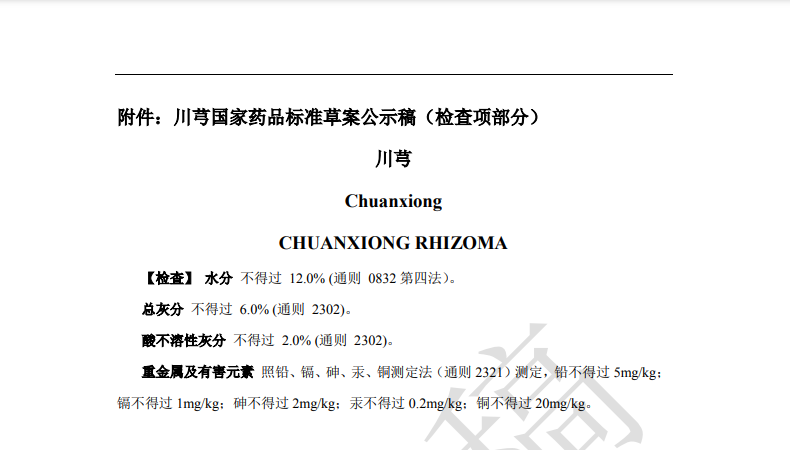 本次草案修訂,主要是根據(jù)產(chǎn)品重金屬及有害元素蓄積及與土壤相關性研究結果,擬新增重金屬與有害元素檢查項。均要求【重金屬及有害元素】照鉛、鎘、砷、汞、銅測定法(通則2321)測定,鉛不得過 5mg/kg;鎘不得過1mg/kg;砷不得過2mg/kg;汞不得過 0.2mg/kg;銅不得過 20mg/kg。