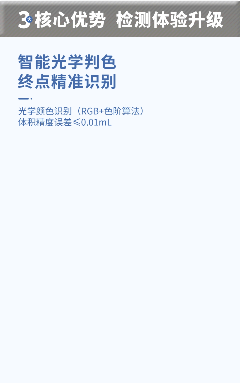 2、模擬人工自動進行滴定,內置RGB模式算法、色階判斷,自動判斷滴定速度、終點,提高滴定效率;